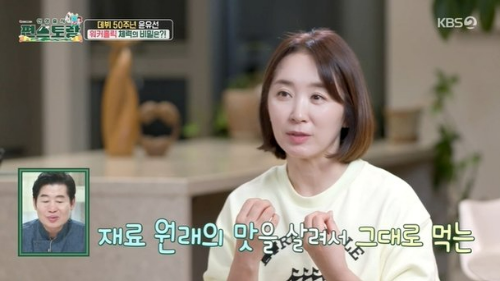 편스토랑에 출연해 그동안 알려지지 않았던 요리 솜씨를 뽐냈었는데요. 윤유선은 요리 관련 책을 발간했을 정도로 요리에 관심과 열정이 많다고 합니다. 한때 윤유선 가지덮밥, 양배추 라떼, 오이소박이물김치 등 레시피가 화제가 되었어요.